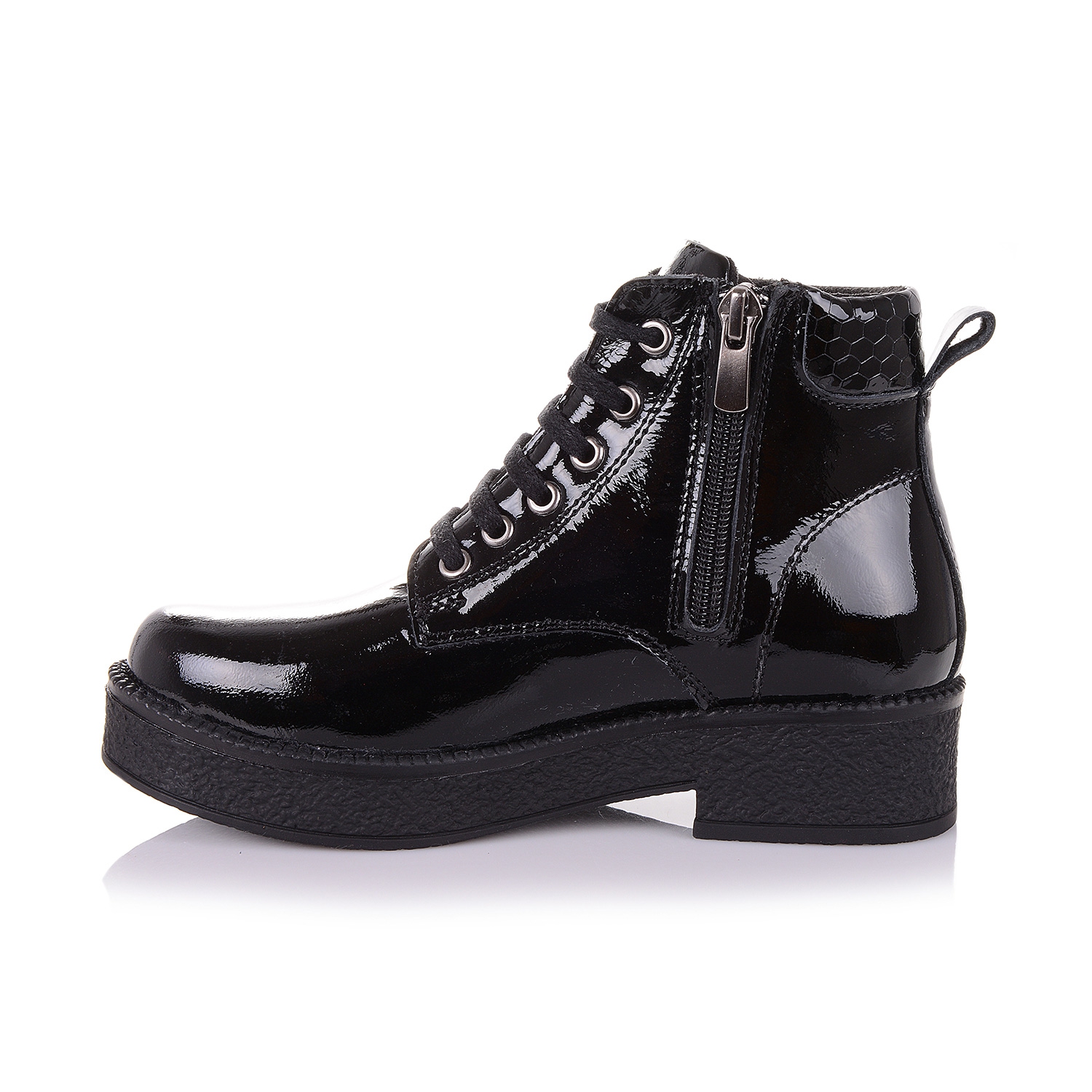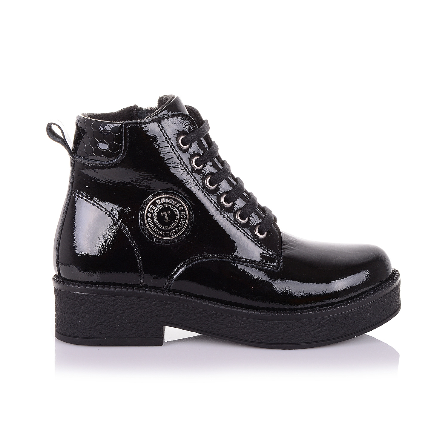 Шикарные демисезонные ботинки для незабываемого образа Вашей модницы. Снаружи ботинки выполнены из лаковой кожи черного цвета, внутри- плотный флис. Надевать такие ботинки - секундное дело, ведь помимо шнурков в них есть ещё и молния сбоку. Анатомическая стелька с супинатором поддержит свод стопы и поспособствует здоровому развитию мышц. О фиксации голенища и щиколотки позаботится жесткий задник. В такой обуви класса премиум +, ребенок будет чувствовать себя эксклюзивно!