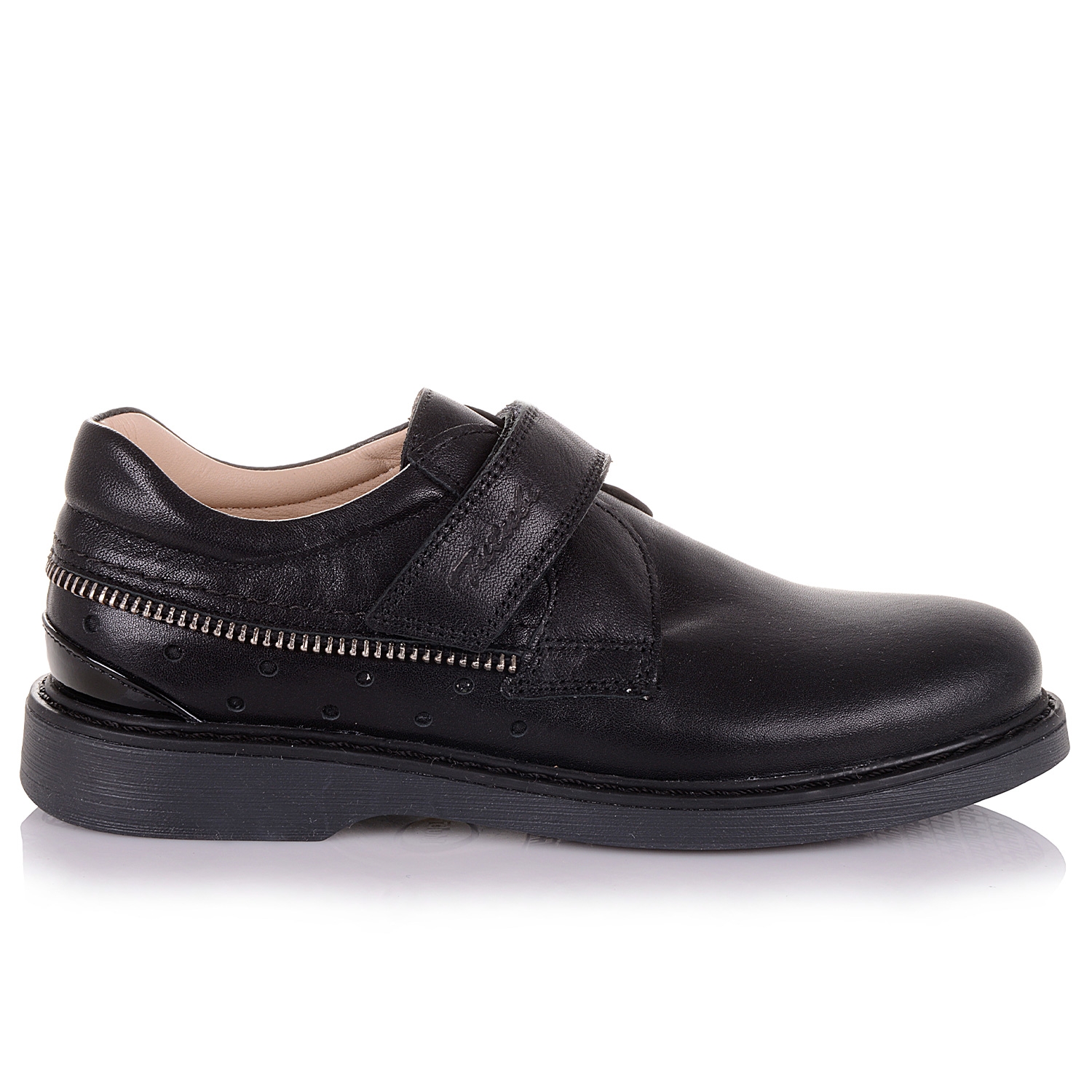 Шкільні туфлі чорного кольору виконані в лаконічному стилі, чудово поєднуються практично з будь-яким одягом. Взуття виготовлене з натуральної шкіри. Це забезпечує оптимальну терморегуляцію, а також запобігає зайве потовиділення і алергічні реакції. Спеціальна устілка з супінатором підтримує склепіння стопи та знижує навантаження на суглобово-зв'язковий апарат. Жорсткий задник фіксує кістку п'яти в правильному положенні. Підошва з термоеластопласту – гнучка і разом з тим міцна, захищає стопу від деформації і пошкоджень, амортизує крок. Наявність липучки забезпечує надійну фіксацію мокасин на нозі.