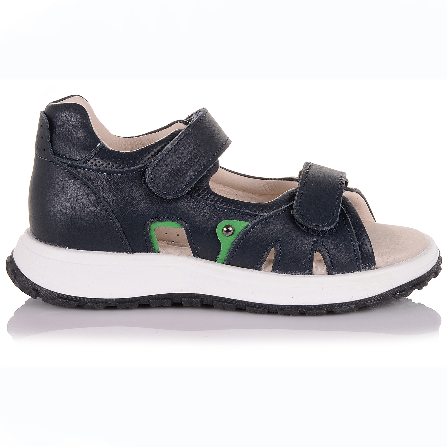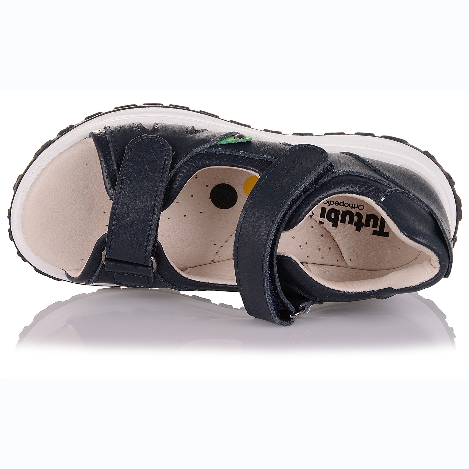 Купити дитяче взуття на літо для активних ігор, щоб було зручне та якісне - непроста задача. Радимо звернути увагу на нову модель від Тутубі. Зовнішня частина босоніжок для хлопчиків виконано з натуральної шкіри темно-синього кольору. Зручна фіксація на дві липучки дозволяє підібрати дитячі босоніжки на ногу різної повноти і висоти зводу. Устілка шкіряна, з супінатором, забезпечує фізіологічно правильне положення ніжки. Легка анатомічна зносостійка підошва зроблена з термокаучука - зносостійкого та практичного матеріалу.